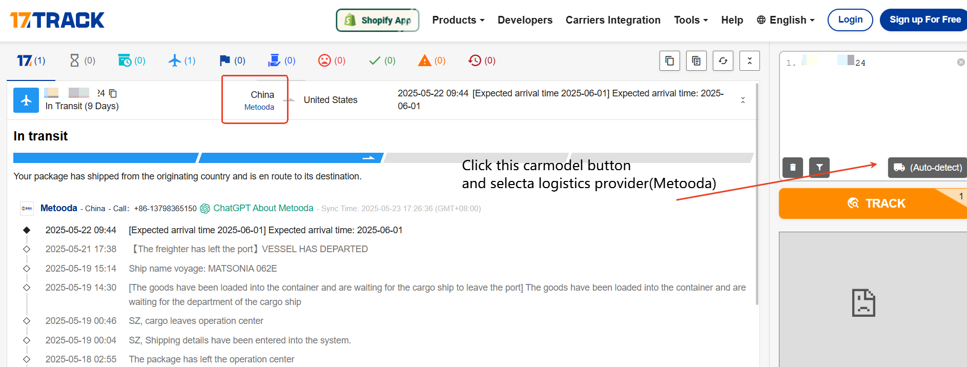 B. Click this car model button and select the logistics provider (Metooda) to query all logistics information of the tracking number you entered.