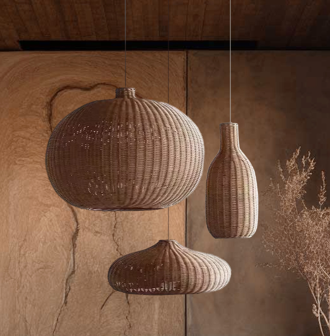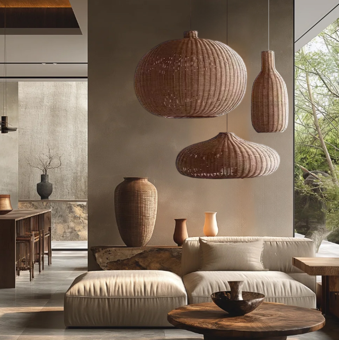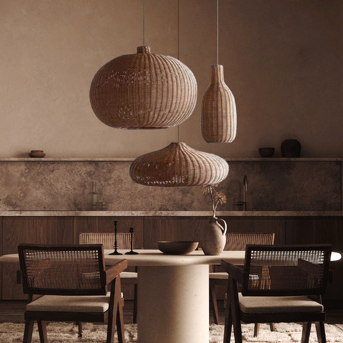 Selected natural rattan materials are used to hand-weave lampshades in different shapes, including round and full spheres, slender and elegant bottle shapes, etc., which are hung in the dining room in combination. The diverse shapes inject the agility and elegance of Japanese aesthetics into the space.