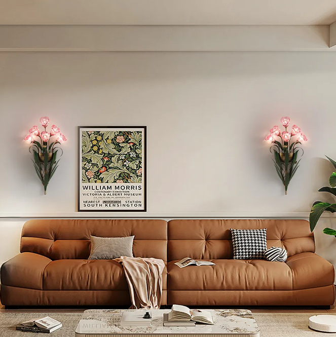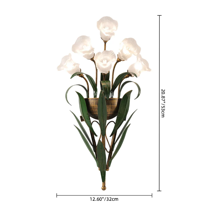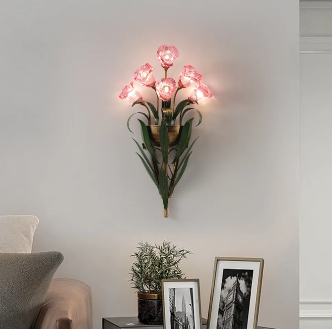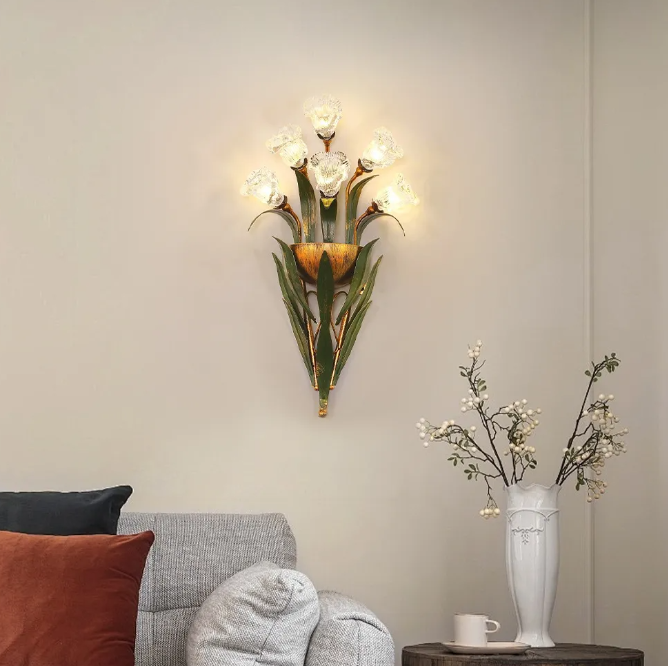 This wall lamp is uniquely designed with lifelike flower shapes, crystal clear glass flower lampshades, retro metal flower stems and emerald green leaves. When the light is on, it emits a soft and charming halo, creating a warm and romantic atmosphere.