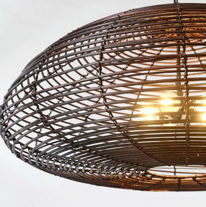 An intriguing pendant light, that is totally surrounded with the dark brown rattan sticks that give it this powerful authoritative stance. What is interesting about it is the light that it holds. It looks like a thick planetary core that is being enthralled by the sheer number of thin rattan pieces.