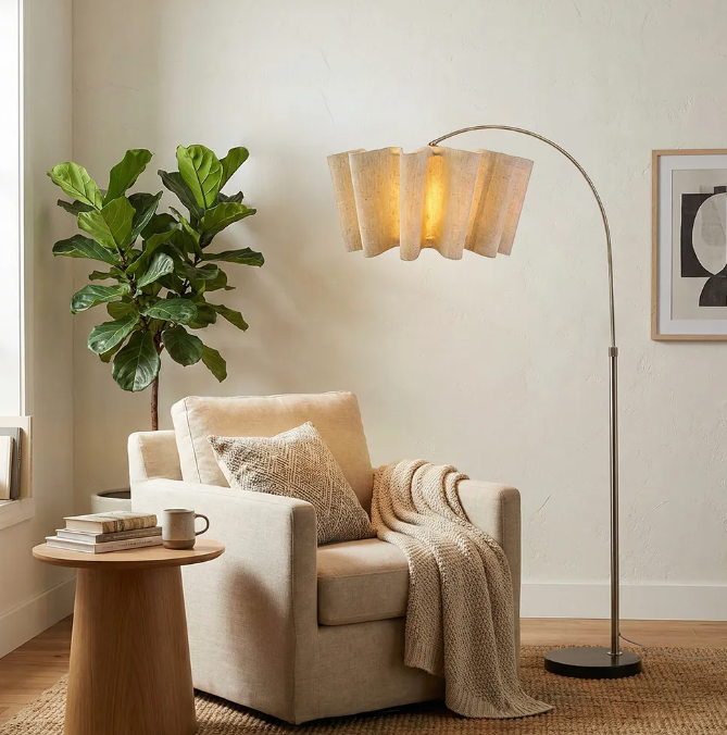 This floor lamp perfectly blends Nordic minimalist aesthetics with practical elegance, adding a touch of brightness to your living space. The unique wave-pleated fabric lampshade emits a soft glow, creating a warm and comfortable atmosphere.