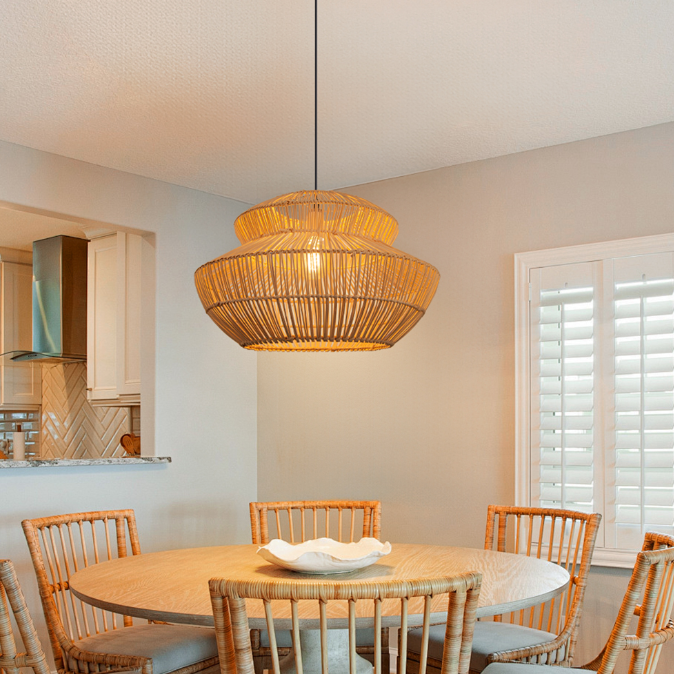 Made from natural rattan, the double-layered lampshade is crafted using a hand-woven technique. The layered design allows light to diffuse softly in the space, creating a warm and healing atmosphere.