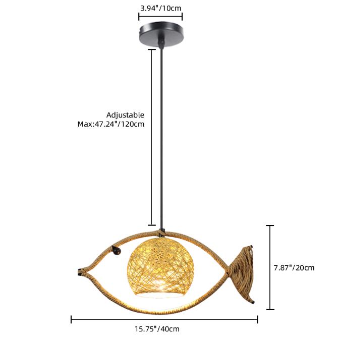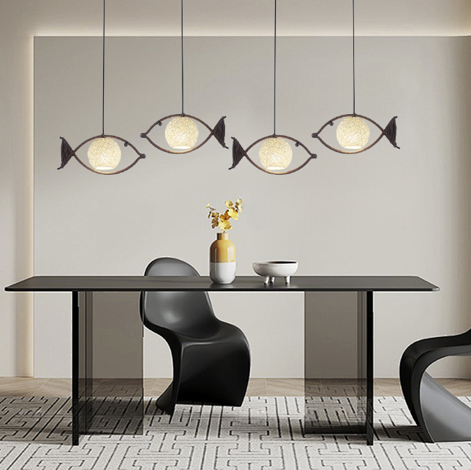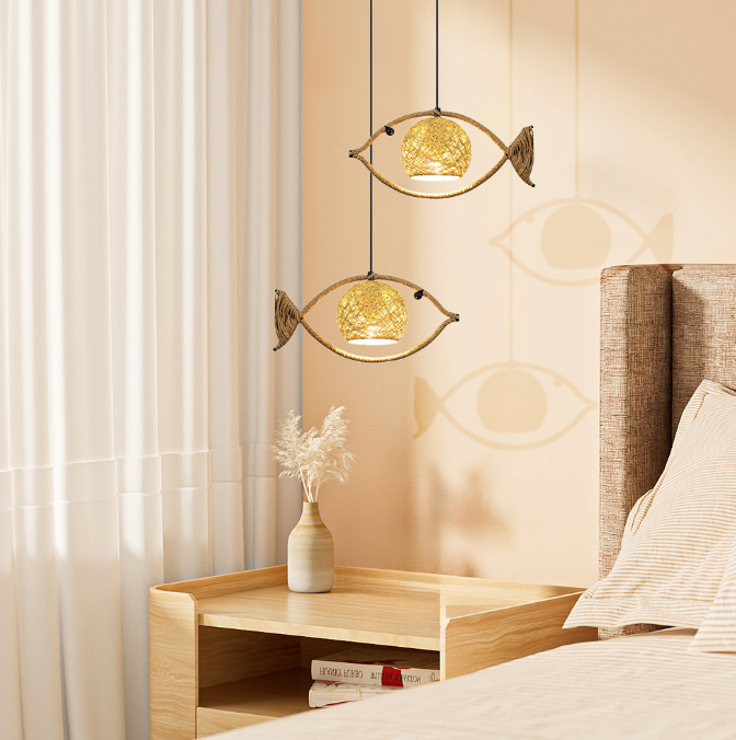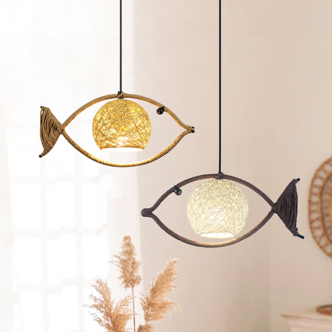 The elegant fish-shaped frame paired with a natural rope lampshade creates a rustic and natural texture, while warm light filters through the woven patterns to create soft shadows.
