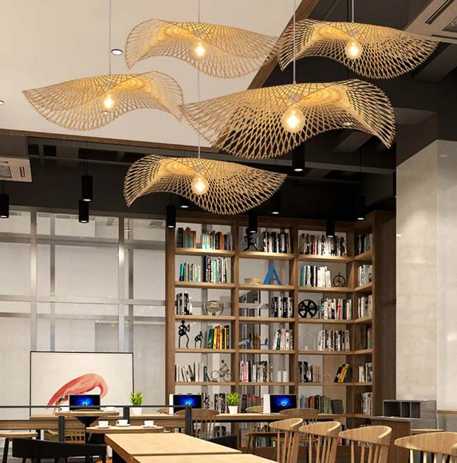 The Japanese restaurant showcases a charming straw hat chandelier, exuding a rustic charm that transports guests to the heart of traditional Japanese homestays. This unique lighting fixture, adorned with a bamboo lampshade, skillfully hand-woven to mimic the shape of classic straw hats, hangs delicately above, casting a warm, ambient light that envelops the space in a cozy, inviting glow.