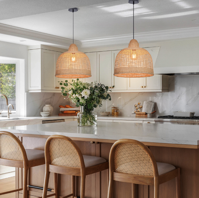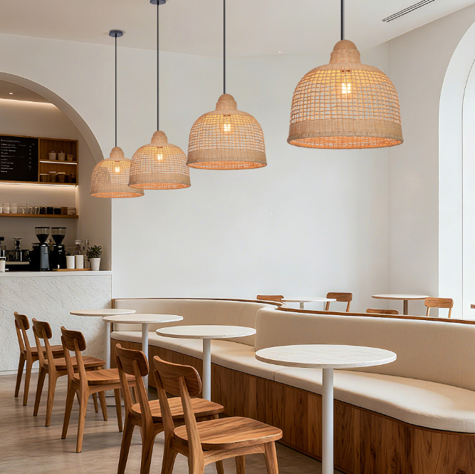 The lamps are made of natural rattan, hand-woven into a transparent mesh shape. When the lights are turned on, the warm light diffuses softly through the gaps in the rattan weave, creating a relaxing atmosphere in the dining area.