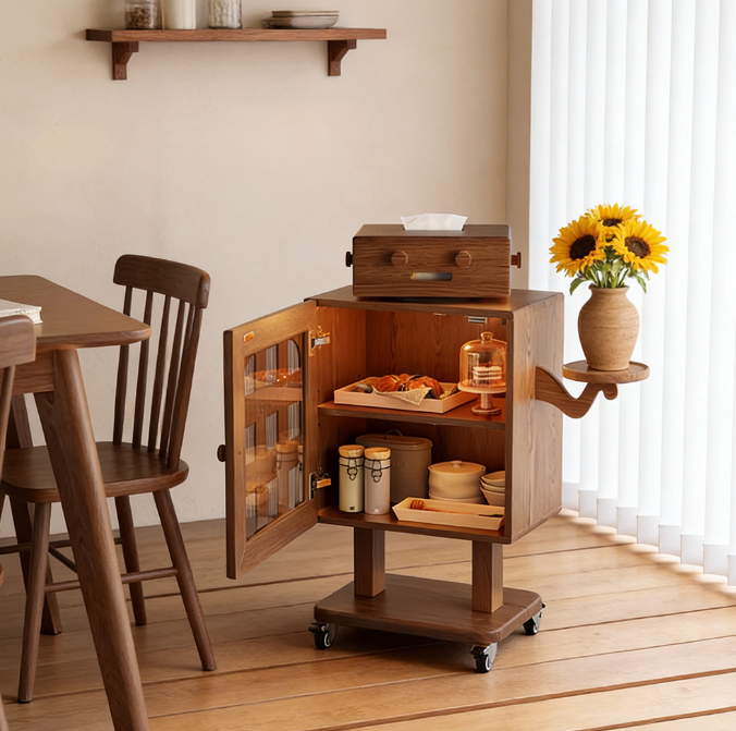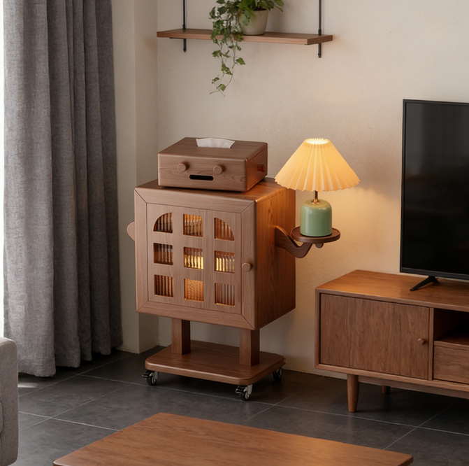 The robot design exudes a playful vibe, while the solid wood texture complements various spaces. The cabinet features layered storage and a caster design for flexible movement.