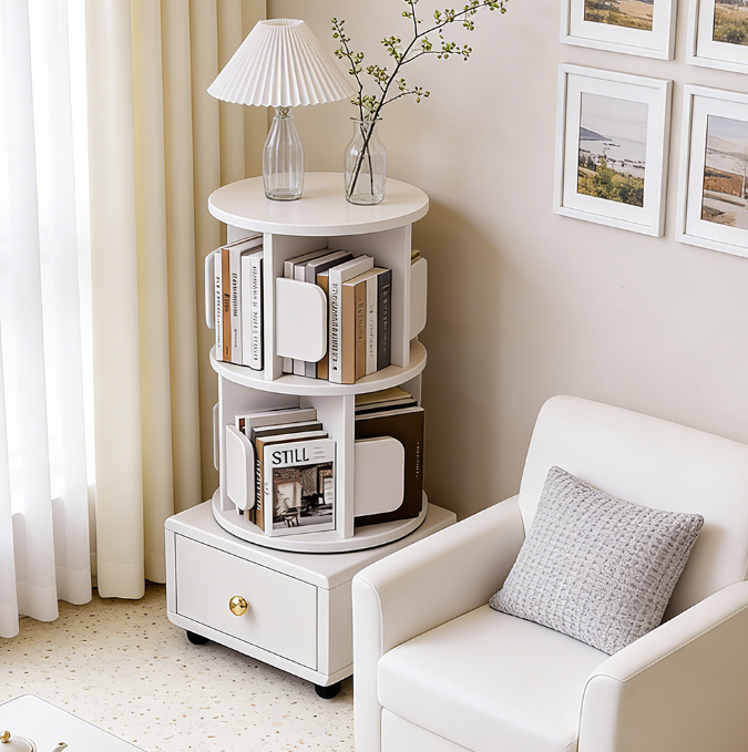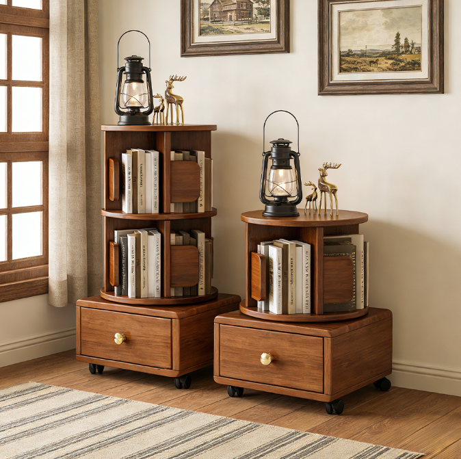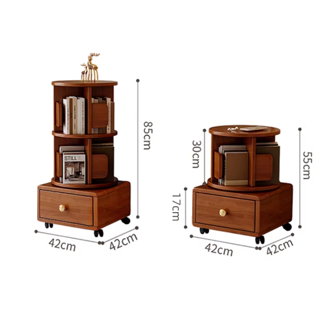 Made of solid wood, its simple design complements various home styles. The rotating structure makes it easy to put and take items on each shelf, and the wheels allow for flexible movement.