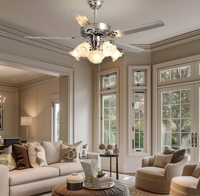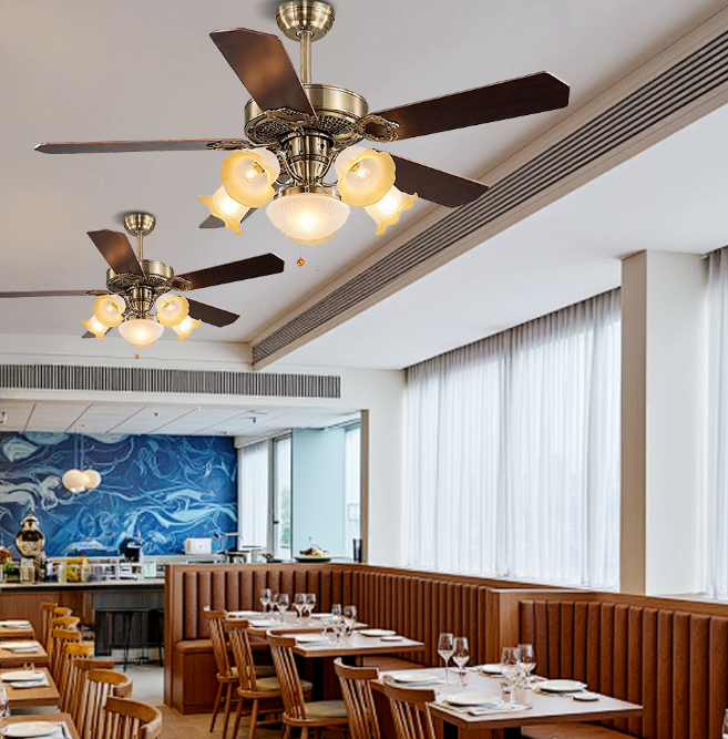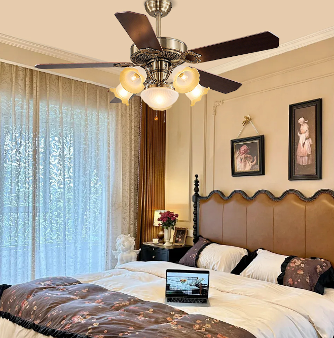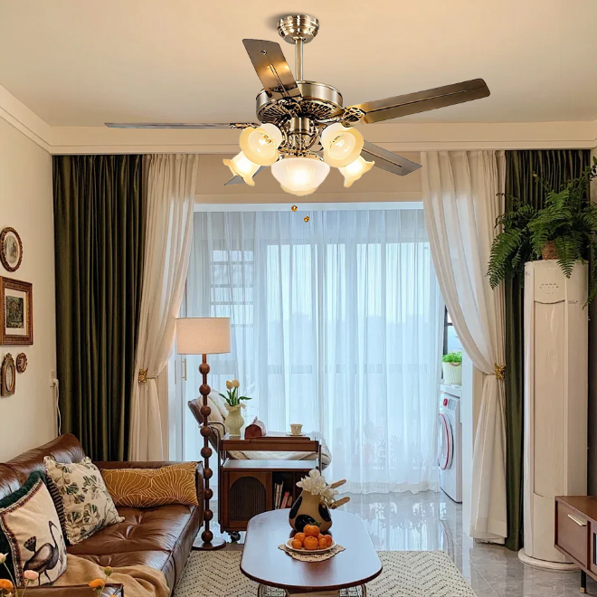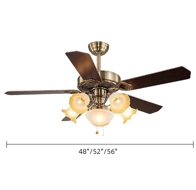Retro copper and gold color matching, dark solid wood fan blades, suitable for Nordic, retro and other diverse styles, easily integrated into the living room and bedroom space. The five-blade design adds strong wind power, quickly circulates air, and dispels stuffiness; the combination of multiple lampshades provides soft light without glare, practicality and beauty coexist, reshaping the comfortable aesthetics of home.