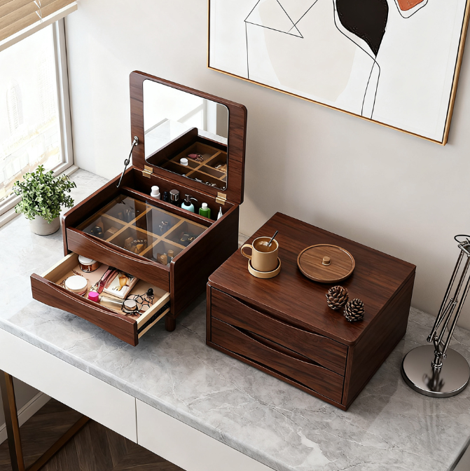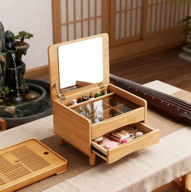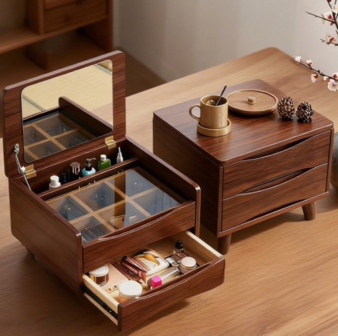 This Nordic mini dressing table, crafted from premium solid wood, combines makeup storage with storage. Its flip-top mirror and multi-layered storage compartments keep makeup tools and skincare products organized.