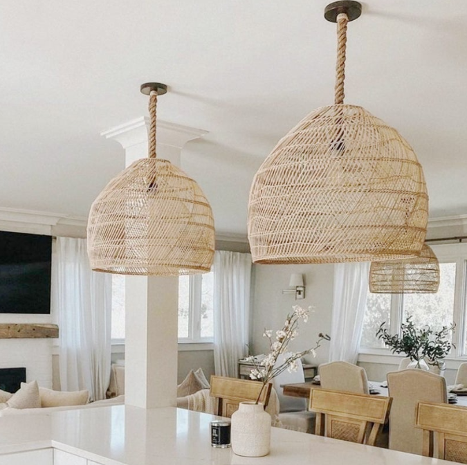 The handmade rattan pendant lampshade bring a breeze of coastal charm to your kitchen island, masterfully blending natural materials with a relaxed, seaside aesthetic.