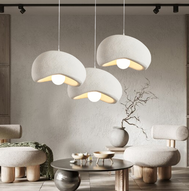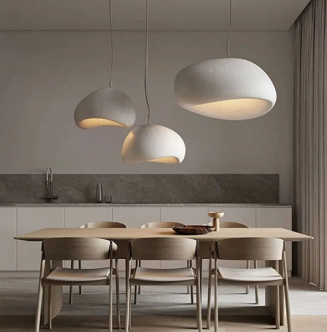 The creative micro cement chandelier showcases a rustic charm with its subtle textures and earthy tones, harmonizing beautifully with any minimalist or modern interior design. It emits a warm, ambient glow that creates a cozy atmosphere, perfect for intimate dinner gatherings or everyday meals with family.