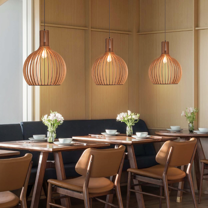 This chandelier features a smooth, dome-shaped design and is crafted from exquisitely hand-assembled solid wood strips. Light filters through the staggered grilles, creating rich, layered play of light and shadow, infusing your dining room, bar, or kitchen island with a warm and soft ambiance.