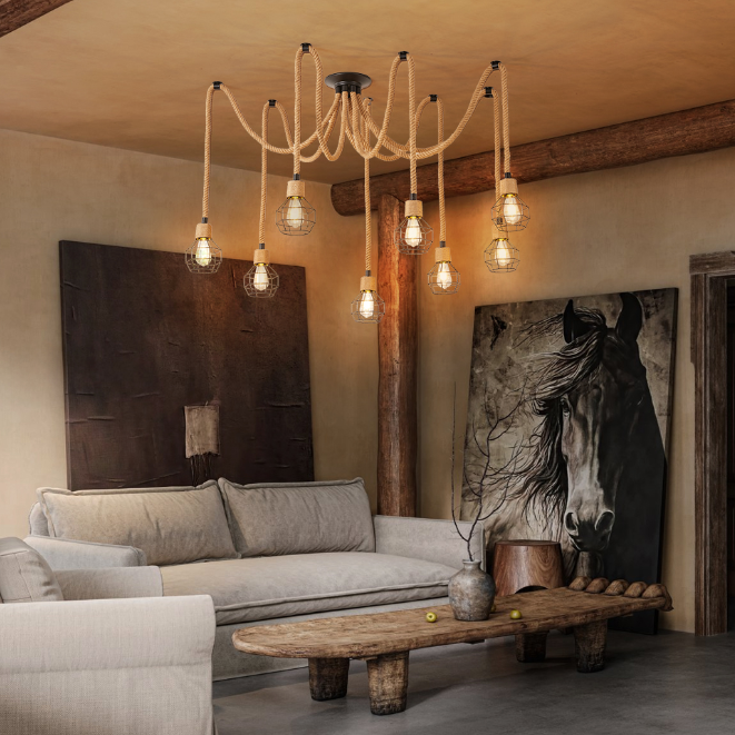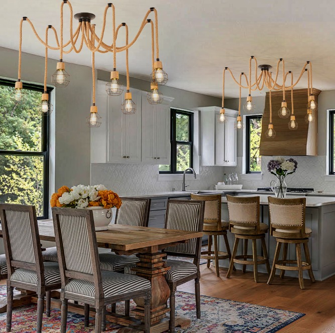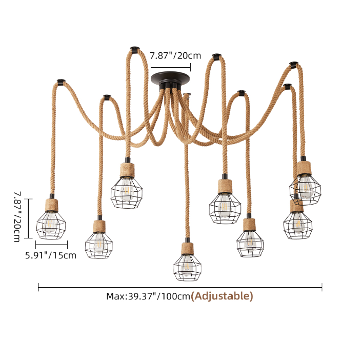 The iron grid light bulbs are connected in series with hemp ropes. 8 groups of lamps are staggered and dangling, with a retro industrial style that is suitable for the restaurant space. When lit, the warm light diffuses through the grid, injecting an artistic and nostalgic atmosphere into the dining scene.