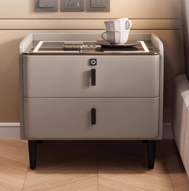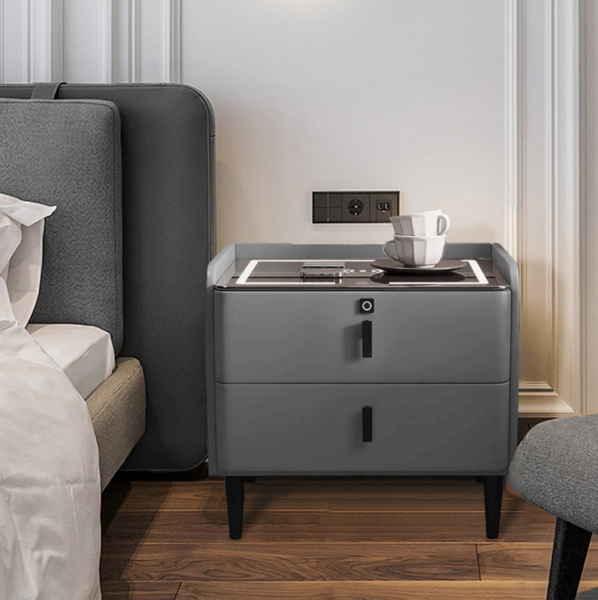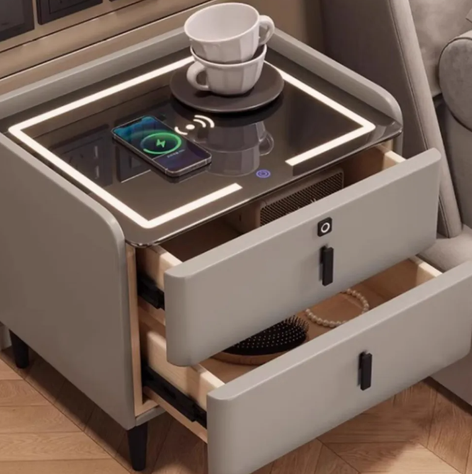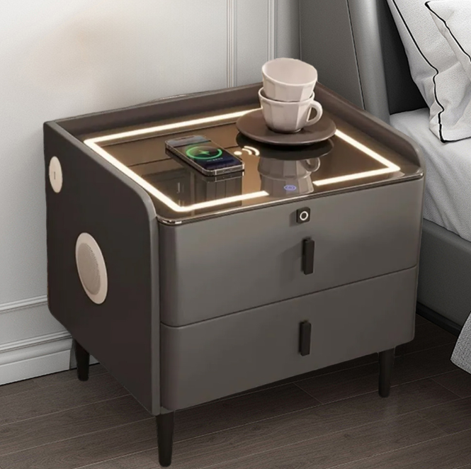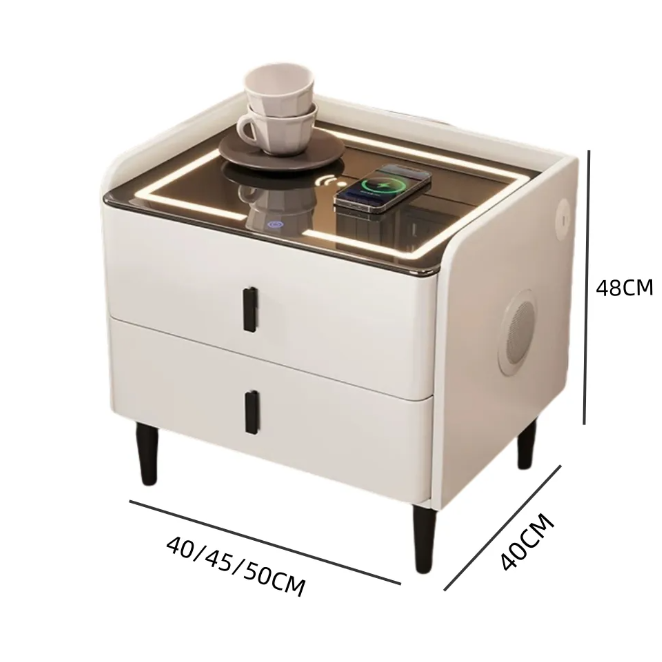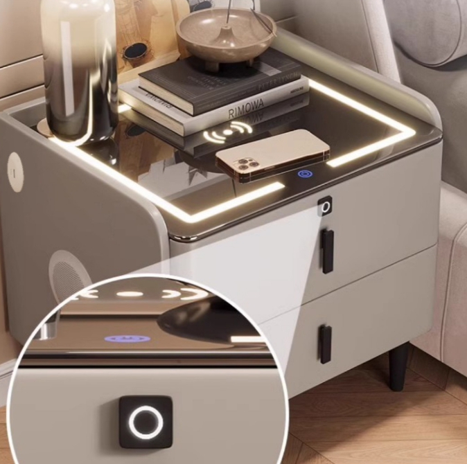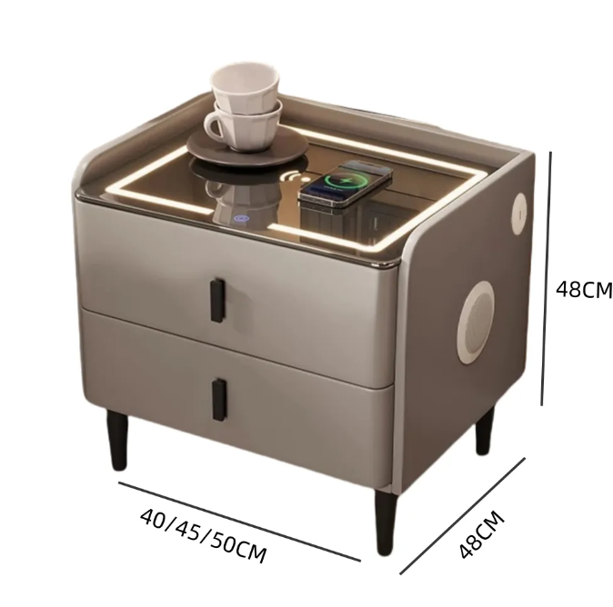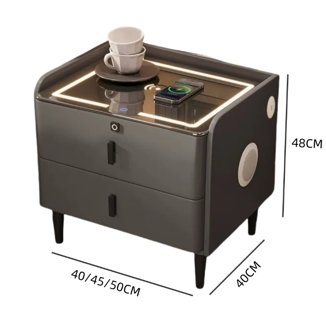This bedside table integrates ambient lighting, wireless charging, Bluetooth speakers and fingerprint unlocking functions. It is available in 40/45/50cm sizes to fit a variety of spaces and enhance the bedroom experience.