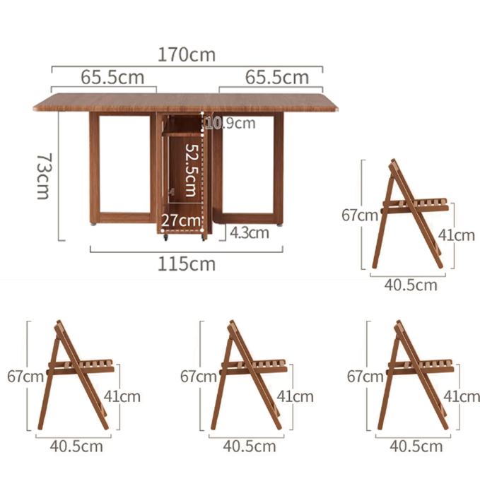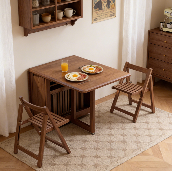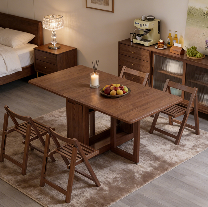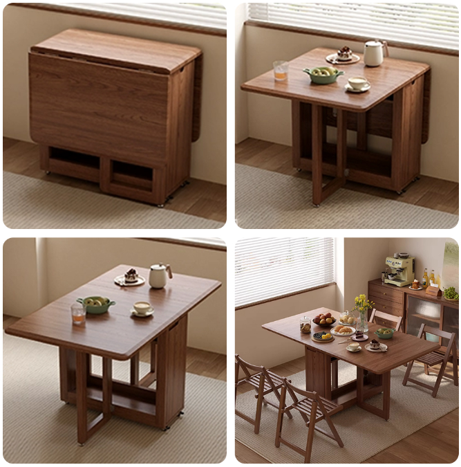 This table comes in three modes: fully folded, half-open, and fully open. When fully folded, it can be stored flush against the wall; when half-open, it's just the right size for one person; and when fully open, it transforms into a standard rectangular dining table.