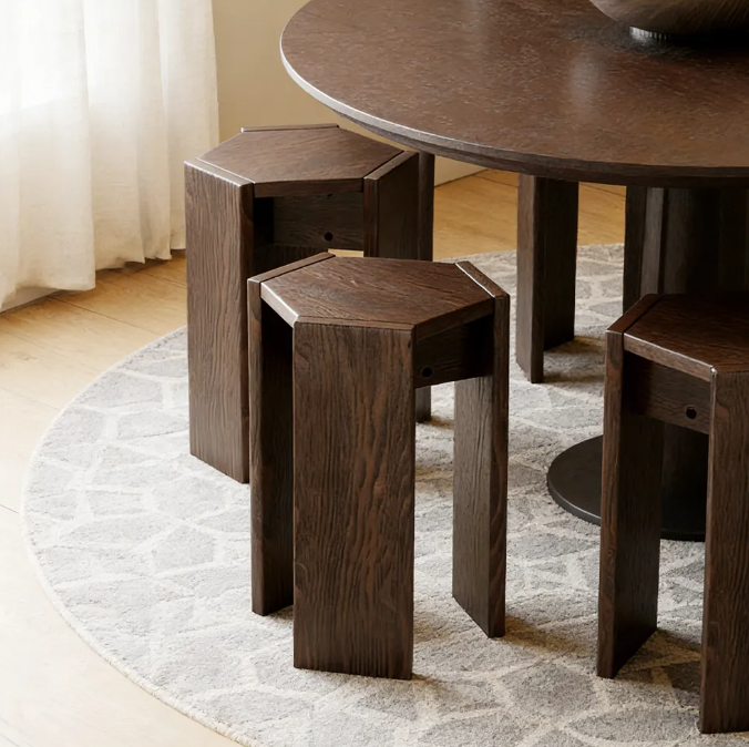 This dining stool is crafted from solid wood. Its unique hexagonal shape breaks away from traditional designs, allowing for easy folding and storage, making it suitable even for small apartments.