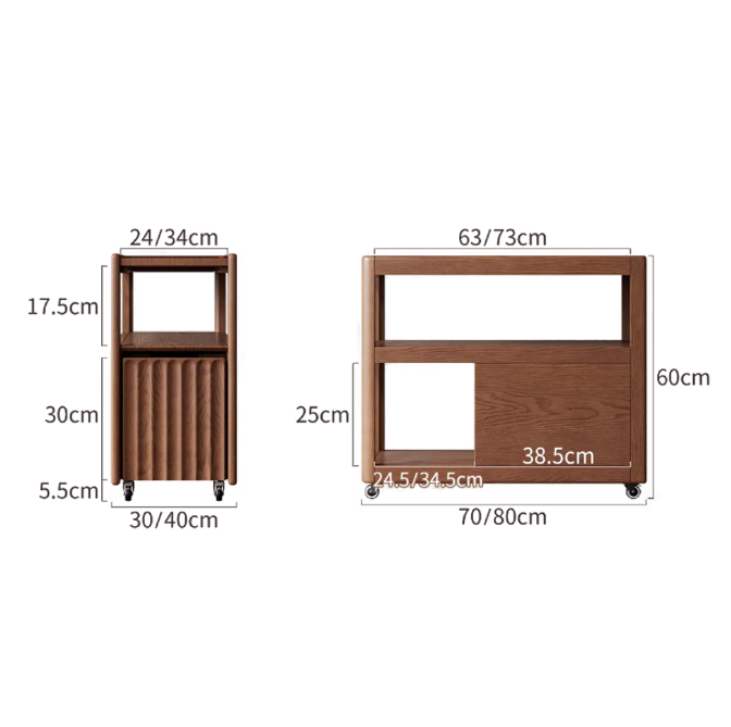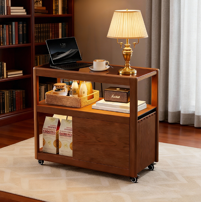 Made of solid wood, it is environmentally friendly and healthy and suitable for various home decorations. The double-layer countertop and hidden storage area can easily store various items. The wheel design allows for flexible movement, making it both a storage table and a mobile tea bar.