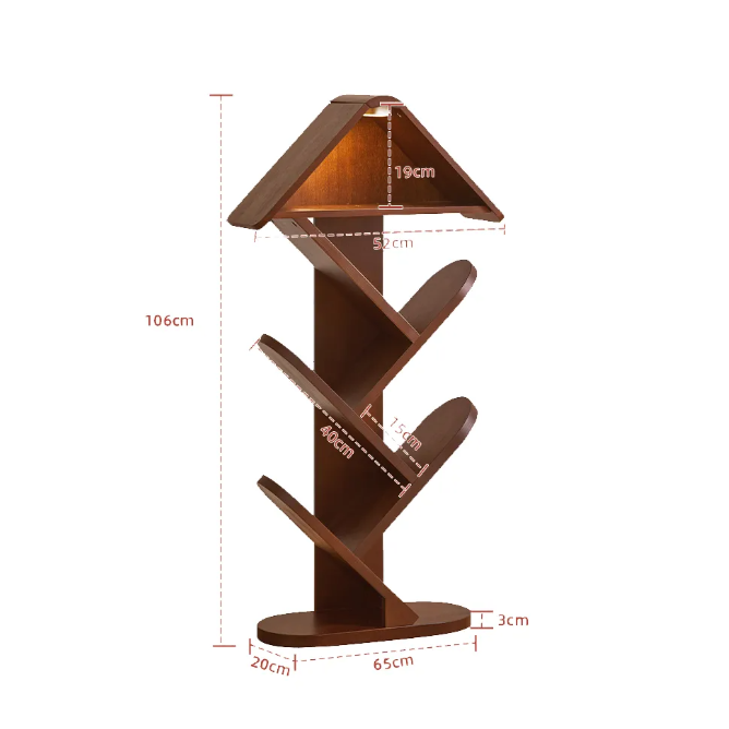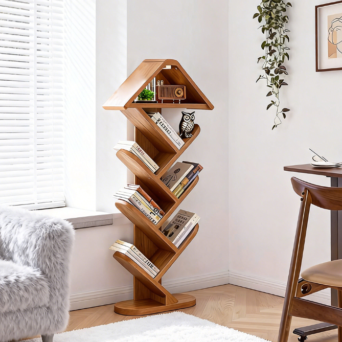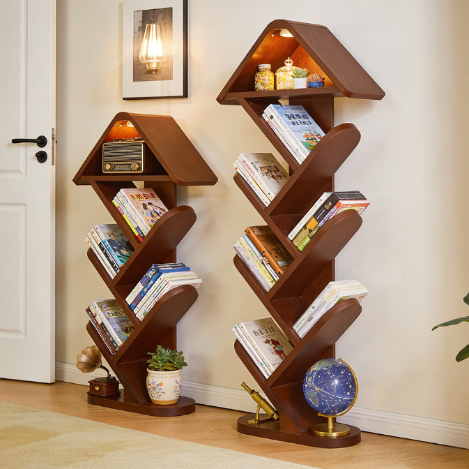 This bookshelf is made of solid wood and features a unique tree-shaped, staggered, layered design, allowing picture books and toys to be neatly arranged. The wide, stable base prevents it from wobbling and saves space.
