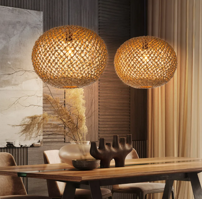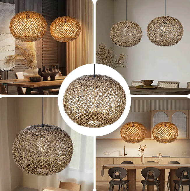 High-quality seaweed and rattan are used, and they are hand-woven. Each lamp is unique, adding a unique artistic atmosphere to the space. The light shines through the gaps in the seaweed and rattan, forming a soft and layered light and shadow, creating a warm and romantic atmosphere.
