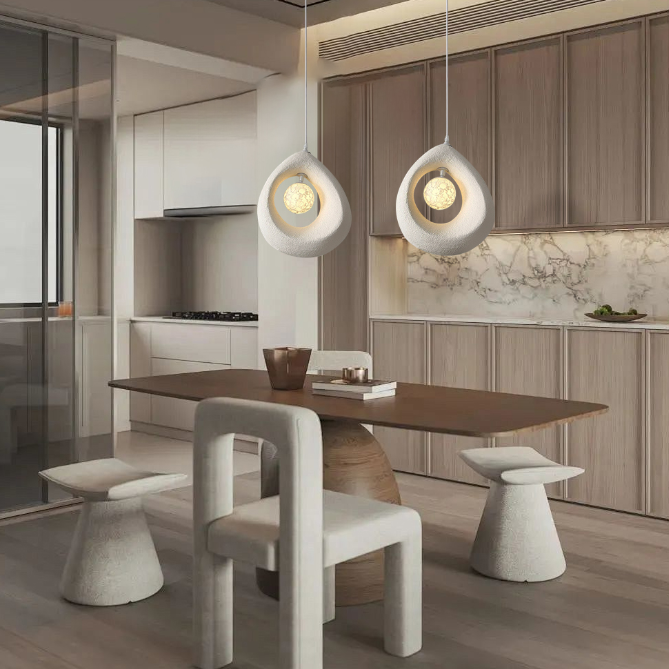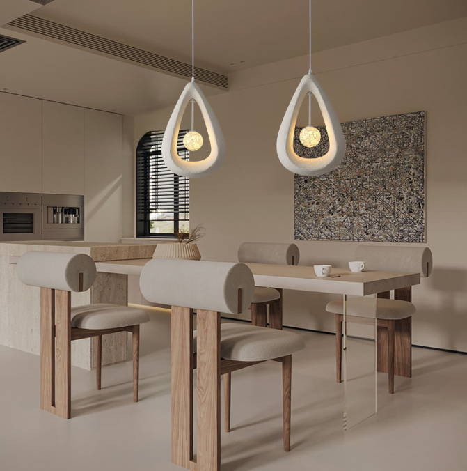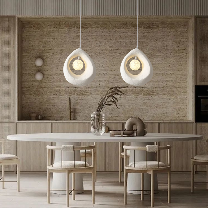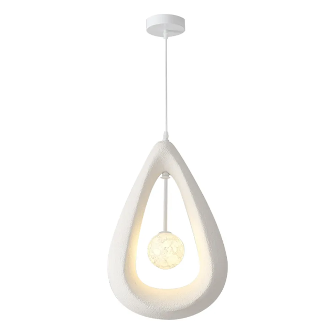 This wabi-sabi teardrop pendant lamp features a unique hollow teardrop design and moon-textured lamp core, infusing the bedroom with an artistic, ambient vibe while elevating the overall aesthetic.